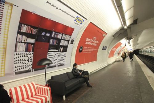 ¿Se imaginan una estación de metro amueblada con sofás, biblioteca, sillas, butacones y y una televisión que supere las cincuenta pulgadas? ¿Cómo reaccionarían en su parada favorita trasnformada en una ‘salita’ doméstica más o menos arreglada con cierto gusto? Hace unas cuantas semanas los viajeros del suburbano de París contemplaron una curiosa escena en cuatro de las estaciones más concurridas, amuebladas al estilo Ikea, en una acción que no es única, pero que resulta llamativa y singular. Y eso es precisamente lo que pretendía la firma sueca con este street: mostrar una colección de sus muebles en una exposición abierta a los clientes del metro para que pudieran observar, y probar, los diferentes productos de la muestra. También las paredes del metro tuvieron su preparación, con el fin de ambientar mejor el metro parisino y acerc arlos, como si fuera el salón de su casa, a los sorprendidos viajeros.