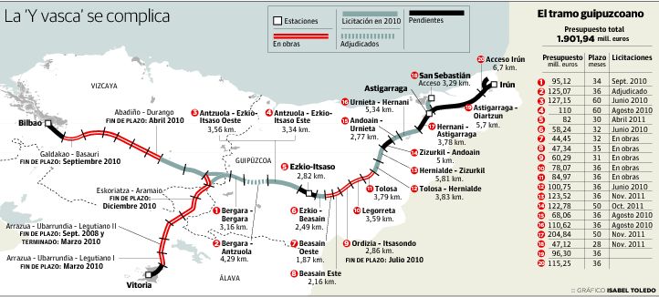 El ramal entre Bergara e Irún, por su parte, sería gestionado por el Gobierno vasco. En este caso, la previsión de gasto ascendió a 1.642 millones de euros, todos en territorio guipuzcoano. La base económica para el acuerdo se alcanzó cuando el Gobierno central admitió que los proyectos de obra del ramal guipuzcoano se supervisaran y se ejecutaran desde Euskadi, que adelantaría para ello un dinero que recibiría después vía Cupo. Es decir, descontando los costes de la ‘Y’ del pago que Euskadi debe realizar al Estado por los servicios que éste presta en la comunidad autónoma. Es una fórmula parecida a la adoptada recientemente para impulsar el TAV navarro. Madrid lo paga todo, pero la comunidad foral adelanta una parte para dar más agilidad al proceso y disponer antes del AVE.
