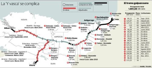 El Gobierno vasco ha hecho pública recientemente su previsión de gasto en el TAV guipuzcoano. Lo ha podido hacer ahora, cuando ya tiene prácticamente perfilados buena parte de los proyectos de obra del ramal, elaborados de forma urgente desde que el consejero socialista Iñaki Arriola se hizo cargo de la cartera de Transportes y marcó la ‘Y vasca’ con el sello de la prioridad absoluta. Con esos datos en la mano el Ejecutivo ha realizado incluso un folleto propagandístico donde explica los 20 tramos de obra en los que se ha dividido la infraestructura entre Bergara e Irún y detalla el presupuesto de cada uno. Hace pocas fechas lo presentó ante los agentes del sector de la construcción en la feria Construlan, en el BEC de Bilbao.