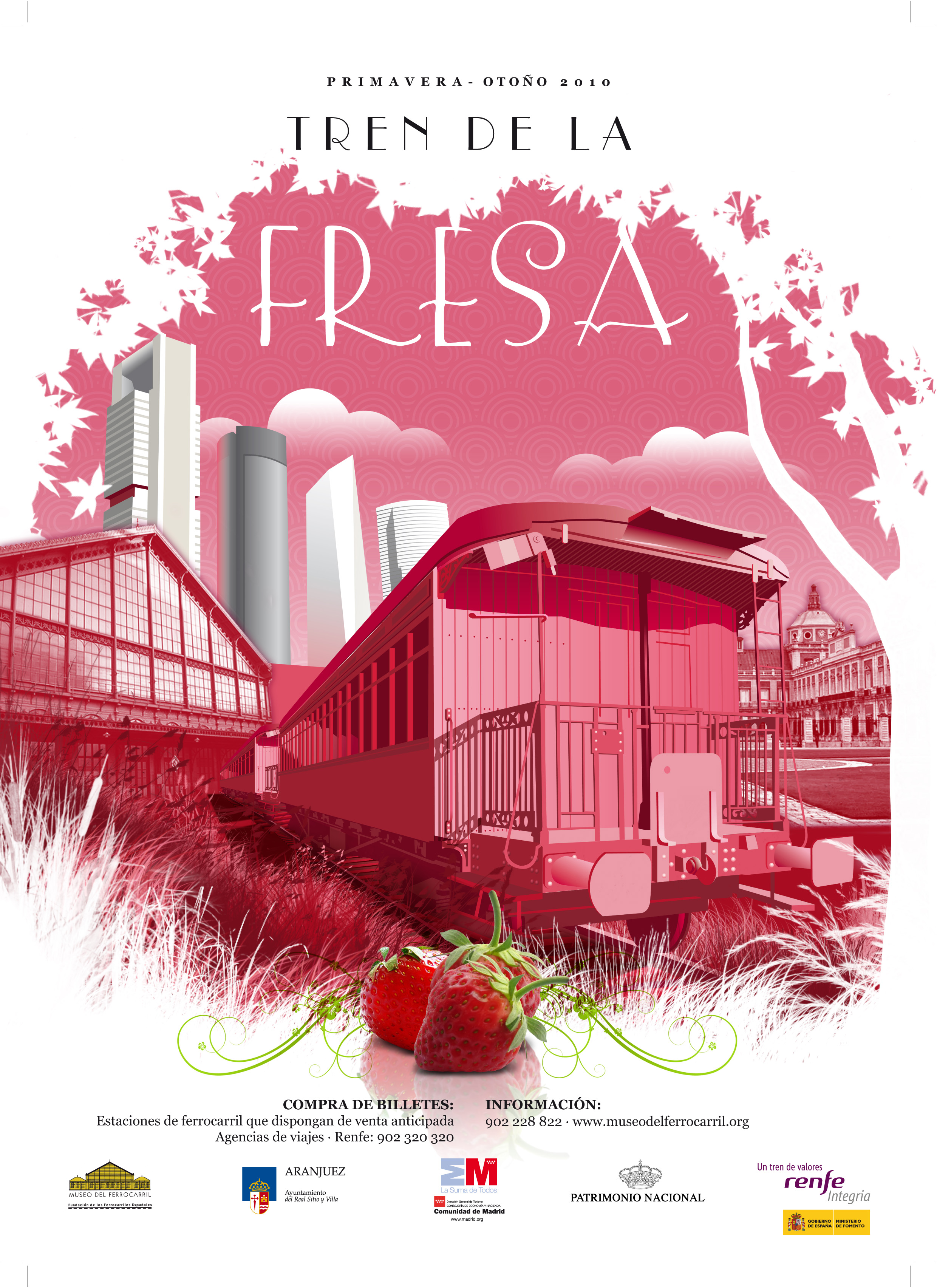 ‘El Tren de la Fresa’ es una apuesta de la Fundación de Ferrocarriles Españoles y el Museo del Ferrocarril, en la que colaboran la Consejería de Cultura y Turismo de la Comunidad de Madrid, el Ayuntamiento de Aranjuez, Patrimonio Nacional y Renfe. El trayecto del ‘Tren de la Fresa’ discurre por la segunda línea más antigua de l Península ibérica, inaugurada por Isabel II en 1851 para unir Madrid con el Real Sitio de Aranjuez. El viaje dura casi una hora y, a lo largo de los trayectos de ida y vuelta, unas azafatas ataviadas con trajes de época ofrecen sabrosos fresones a los viajeros, quienes, una vez en Aranjuez son guiados en visita turística al Palacio Real, a la zona monumental de la ciudad, y al Museo de Falúas.
