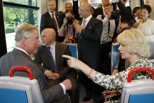 El Príncipe Carlos, vestido con un traje gris y corbata y pañuelo en tonos rojizos, y Camila, ataviada con un vestido estampado de flores en torno verdes y beis, han esperado la llegada de uno de los tranvías soportando las temperaturas casi veraniegas que se vivían en Sevilla, en una jornada completamente primaveral.