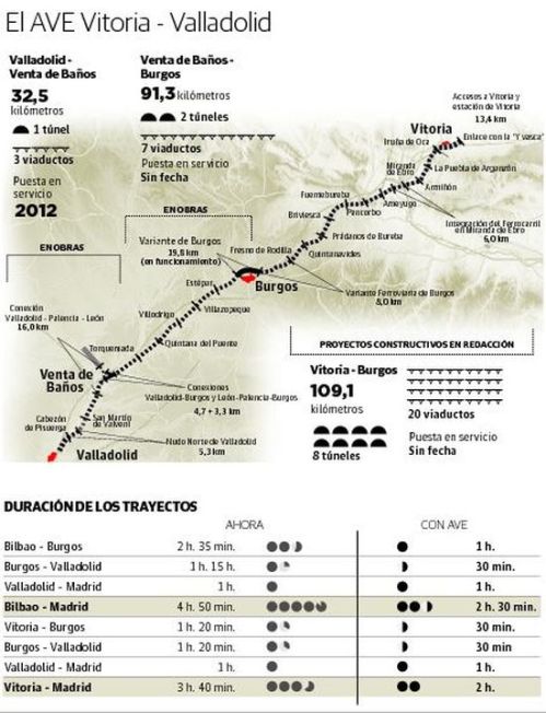 Si seguimos este esquema para ir avanzando, hay que comenzar analizando el segmento Valladolid-Venta de Baños, el más adelantado. De hecho, es el único que, por parte del Ministerio de Fomento, tiene comprometida una fecha de apertura: en 2012. Si se pide a Adif que afine algo más la respuesta es «el 31 de diciembre». Y si es antes, mejor. En cualquier caso, la entrada en servicio de este tramo no supondrá un gran avance para los viajeros vascos, ya que recorrer a alta velocidad en estos 32,5 kilómetros supondrá sólo unos diez minutos menos de