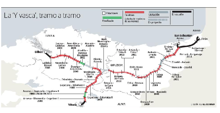 A partir de 2020, cuando Francia tenga lista su nueva conexión del TAV, las unidades que salgan de la capital guipuzcoana se reincorporarán a la nueva plataforma de la ‘Y vasca’, que irá de Astigarraga a la frontera, con una conexión a la altura de Oiartzun. Con el inicio de estas obras, son ya quince los tramos en ejecución, aunque en breve comenzarán las del trayecto Zizurkil-Andoain.