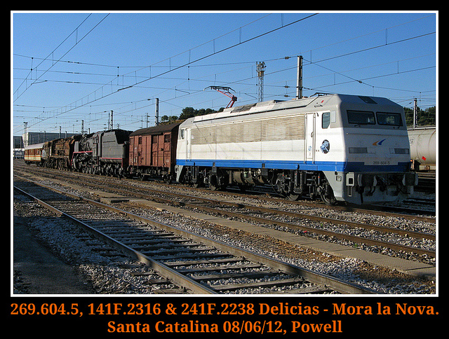 El convoy está en marcha. Ha salido de Delicias y se espera que llegue mañana a Mora la Nova. Encabezadas por ‘La Gata’ y con la 333.107 de Integria a la espera, las dos vaporosas 241F-2238 y 141F-2316, que han permanecido en custodia en Delicias, van camino de su restauración en Mora la Nova. Ambas locomotoras presentan un estado deplorable e incluso han sido vandalizadas, pero serán sometidas a un profundo y exhaustivo trabajo de rehabilitación que les permitirá volver a la vía con algún destino turístico.