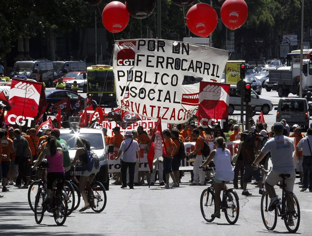 Huelgas, paros y protestas. La Confederación General del Trabajo (CGT) ha convocado tres jornadas de huelga de 24 horas en el ferrocarril para los días 31 de octubre y 5 y 20 de diciembre, y once de paros parciales, entre el 28 de octubre y el 29 de noviembre, ante la segregación de Renfe en 4 sociedades y la división de Adif en otras dos empresas. La CGT señala que la inminente fragmentación de Renfe y la anunciada y próxima división de Adif en dos empresas -una para la red de alta velocidad y otra para la convencional- tendrá «graves repercusiones» en el empleo del personal, tanto de las empresas matrices como de las contratas y subcontratas ferroviarias. El resto de las organizaciones sindicales ferroviarias tampoco descarta llevar a cabo movilizaciones, pero está a la espera del resultado de una reunión a la que han sido convocadas por el Ministerio de Fomento para el próximo miércoles.