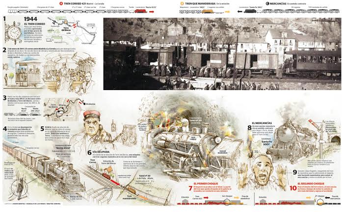 Torre del Bierzo revive estos días la pesadilla que sacudió la pequeña localidad leonesa tal día como hoy hace setenta años. Los vecinos de este municipio leonés fueron testigos del accidente ocurrido el 3 de enero de 1944 que ha pasado a los anales como el siniestro más trágico de la historia del ferrocarril en España. Amortiguado por el franquismo, que incluso en los primeros días de la tragedia llegó a hablar de sabotaje, el registro de Renfe reconoce la muerte de 78 personas, aunque los investigadores sitúan en cerca de 200 el número de fallecidos. (Nunca los 500 ni mucho menos los 800 que llega a inscribir el Guinnes en su macabro registro).