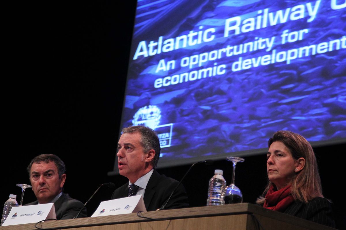 Urkullu y Barrón han participado en Bilbao, junto a José Angel Corres, en una jornada de trabajo con el lema ”El eje ferroviario atlántico, una oportunidad para el desarrollo económico” que ha organizado la Cámara de Comercio Industria y Navegación de Bilbao. También han intervenido la consejera de Medio Ambiente y Política Territorial Ana Oregi; el catedrático Francisco Javier Fernández Macho; Laurent Courbu, presidente de la Cámara de Comercio e Industria Regional de Aquitania; los viceconsejeros del Gobierno Vasco Pedro Hernando y Antonio Aiz; y el presidente de la Cámara de Baiona, André Garreta.