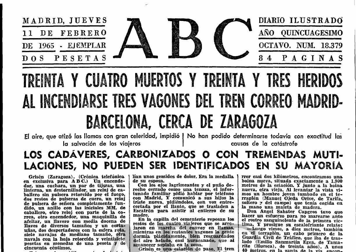 El corresponsal de La Vanguardia, Luis Torres, firmaba la trágica crónica del jueves 11 de febrero de 1965. El periódico abría su primera página con un título escalofriante «31 muertos y 33 heridos al incendiarse tres vagones del tren correo Madrid-Barcelona«. Uno de los peores accidentes de la historia ferroviaria española. «A las seis y cuarto de la mañana, en medio de un fuerte viento, el tren correo número 886, que circulaba de Madrid a Zaragoza, sufrió un grave incendio a consecuencia del cual quedaron completamente destruidos los tres coches de tercera clase que cerraban la marcha del convoy. Las primeras muestras del incendio fueron advertidas al paso del tren por la estación de Grisén, según refieren los viajeros llegados a Zaragoza. En dicha estación, el jefe de la misma y algunos otros ferroviarios notaron que por debajo de uno de los últimos vagones salía humo acompañado de chispas. De momento, no se dio mayor importancia al hecho y el convoy continuó su marcha hacia Pinseque, adonde ya no llegó. Al parecer, según el mozo del tren Antonio Villarejo Hernández, que resultó herido en el siniestro, el fuego comenzó en un departamento del centro de uno de los coches, propagándose rapidísimamente al resto del mismo y a los contiguos que le seguían, razón por la que muchos viajeros no pudieron ponerse a salvo. El fuerte vendaval ayudó de tal manera a la propagación de las llamas que éstas alcanzaron incluso los postes de las líneas telefónicas y telegráficas. Cuando se hizo funcionar la alarma, el convoy había recorrido ya dos kilómetros desde la estación de Grisén. Al aminorarse la marcha del tren, exactamente en el kilómetro 316, comenzaron a lanzarse algunos de los viajeros por las ventanillas, cuatro de los cuales encontraron la muerte en ese momento».