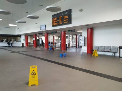 Las goteras vuelven a causar problemas en la estación de León, cuyas instalaciones tienen carácter provisional hasta la llegada del AVE, por lo que no han sido remozadas durante las obras de ampliación. El problema reside, al parecer, en el el diseño de la construcción. En la ‘vieja’ estación, el techo es plano; no lo han renovado y levantado con inclinación a dos aguas, como han hecho con la parte ampliada. Por eso, cada vez que caen unas gotas, aparecen los problemas. Así que resulta habitual ver a los operarios buscar el lugar de la fuga que traspasa el agua hasta el vestidor. Con esta imagen de una estación prácticamente, llaman la atención los cubos con los que recoger el agua de las goteras y las fregonas que lo eliminan del pavimento.