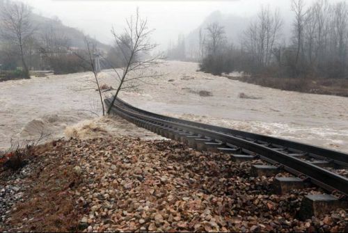 En las proximidades de Cabañaquinta el río Aller desbordó el cauce y se llevó todas las capas de balasto que soportaban la traza de la línea Baiña-Collanzo. La firmeza de las soldaduras y traviesas ha dejado al aire casi 200 metros de vía.