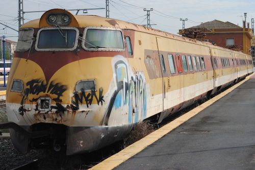Pese a su actual estado, el electrotrén 443, nombre oficial que recibe este original prototipo, es una auténtica joya ferroviaria. Fabricado por Construcciones y Auxiliar de Ferrocarriles (CAF) bajo licencia de Fiat en 1976, se proyecta para estudiar la tecnología de la pendulación activa de los coches de forma que se puede mantener la velocidad en tramos sinuosos, sin menoscabo del confort de los viajeros. Los expertos aseguran que, desde sus primeros viajes, el tren llama poderosamente la atención. Evidentemente ese color amarillo de la carrocería, muy aerodinámica además para la época, le concede notoriedad y su presencia en las estaciones provoca de inmediato la curiosidad ciudadana. Pronto recibe el nombre con el que se le acaba por identificar: ‘Platanito’. Claro está que, después de haber permanecido más de veinticinco años en el dique seco, se hace difícil pensar lo que significa en algún momento para la tecnología ferroviaria. Este automotor basculante inicia en España los pinitos sobre la circulación en alta velocidad.