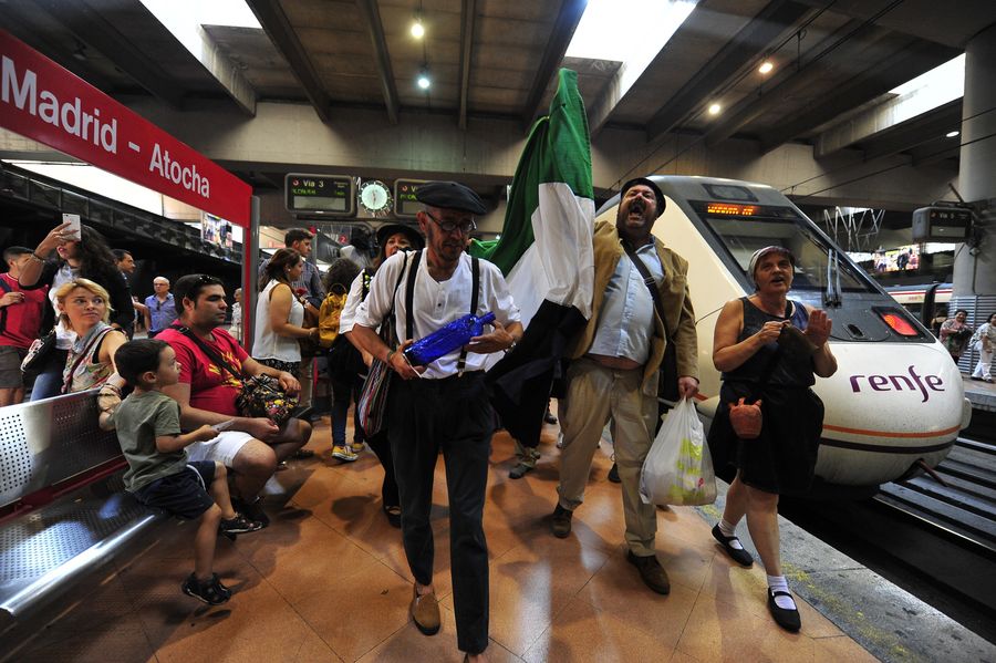La plataforma ciudadana ‘Milana Bonita‘ protagoniza una «performance» en la estación de Atocha de Madrid para reivindicar un tren digno para Extremadura. Ataviados como los personajes de la película ‘Los Santos Inocentes’ protestaron en la capital del reino para reclamar infraestructuras ferroviarias dignas y traraton de llamar la atención de la operadora ferroviaria. Se trata de la primera iniciativa de este movimiento popular, que ha querido que coincida con la celebración del Día de Extremadura. La protesta de este colectivo recibe el apoyo en las redes sociales y en la plataforma Change.org, donde hasta ayer han recogido casi 10.000 firmas.