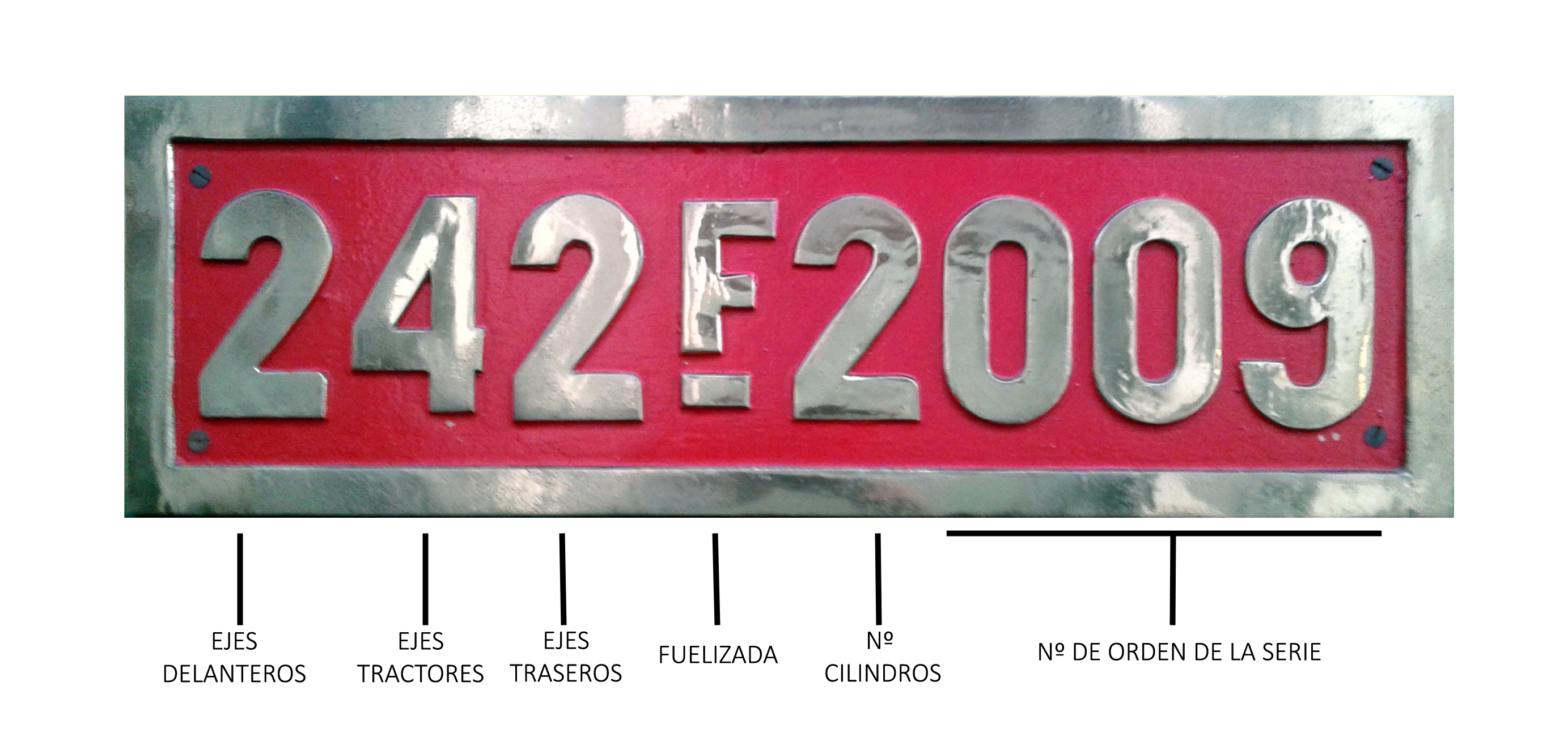 Hasta la constitución de Renfe en 1941, no existe en España un sistema unificado de matriculación; cada compañía ferroviaria dispone de un método propio con algunas variaciones. El sistema utilizado por Renfe es sencillo; empieza por el frontal de la locomotora. La identificación se forma mediante siete cifras, divididas en dos grupos separados por un guión. En el primer grupo, lo tres primeros guarismos indican el tipo de locomotora, según el número y disposición de sus ejes acoplados y libres. El primer dígito se refiere a los ejes libres portadores delanteros o conductores; el segundo a los ejes motores, tractores o acoplados que van unidos con bielas; y el tercer número, a los ejes libres portadores traseros o de arrastre. De ahí vienen algunos de los nombres que definen a cualquier locomotora con una misma disposición de ejes como, Pacific (231), Mikado (141), Mastodonte (240), Montaña (241), Santa Fe (151), etc. Si en la placa aparece la letra ‘F’ sobre el guión, significa que la locomotora está fuelizada, es decir, que en lugar de carbón utiliza fuel como combustible.